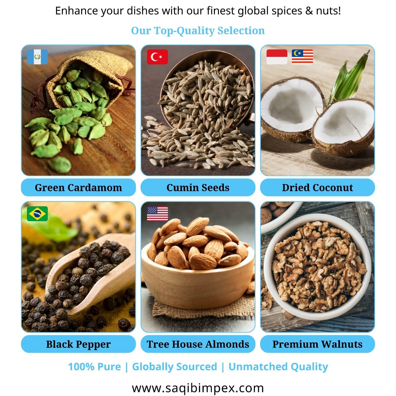 The firm deals in a wide range of imported food products including almonds, pulses, black pepper, dry fruits, spices, and other edible commodities. Saqib Impex ensures consistent product quality through careful supplier selection, strict inspection, and efficient logistics management.